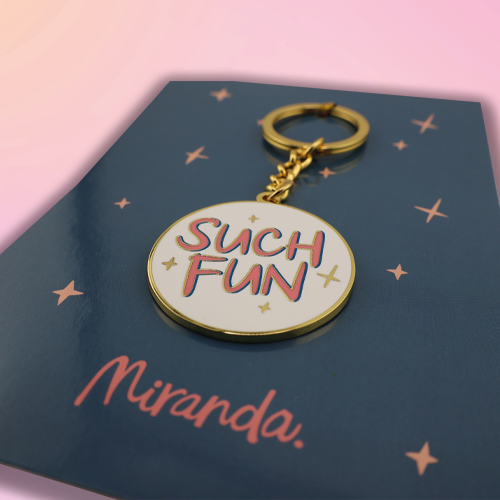 We had the pleasure of collaborating with comedian Miranda Hart to produce a range of promotional items for her “Such Fun” collection. We created a stylish necklace, two vibrant key rings (one presented on a branded backing card), and a unique badge, all featuring her iconic “Such Fun” phrase. These items are perfect for fans looking to carry a piece of Miranda’s humor with them. Each piece was carefully crafted to reflect the lighthearted and joyful spirit of Miranda’s brand.